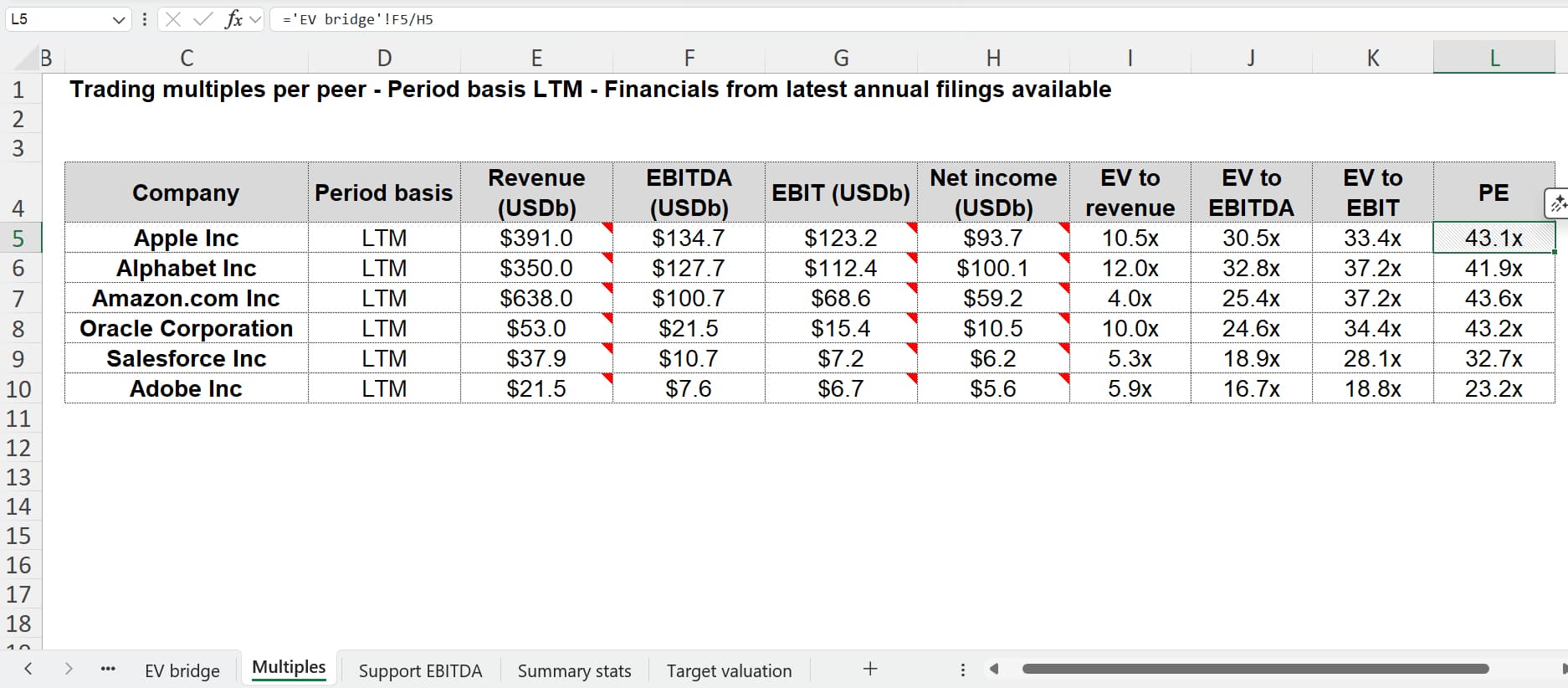 Benchmark Microsoft against a peer set to generate Excel with EV bridges, trading multiples and summary stats. Derive implied valuation from peer medians