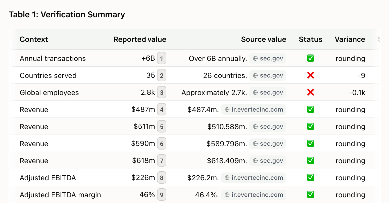 Cross-references every number in Evertec's presentation against SEC filings and earnings releases for inconsistencies. View verification table with precise sources